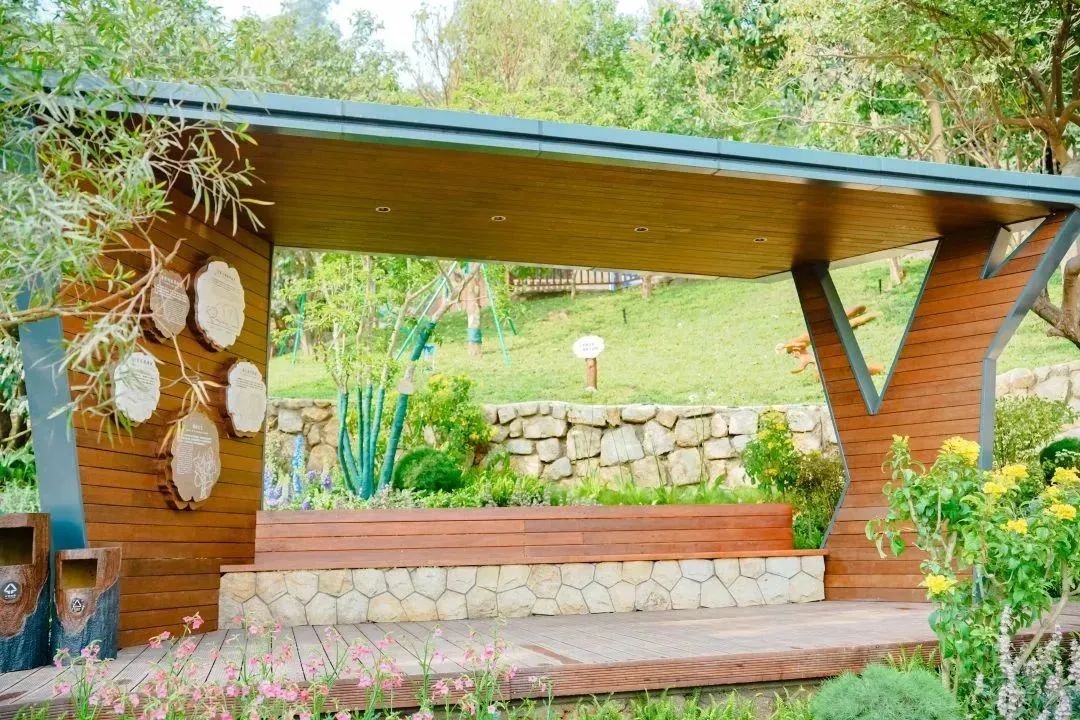 在兩級擋土墻外,公園新建了從地面直達觀景亭的山體棧道,棧道兩側(cè)是由廣東本土黑山石與數(shù)十種花草樹木組成的長效繽紛花境,一路上更有設(shè)置自然知識展板與樹牌花牌,增加了游覽的趣味性與科普性。