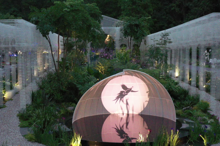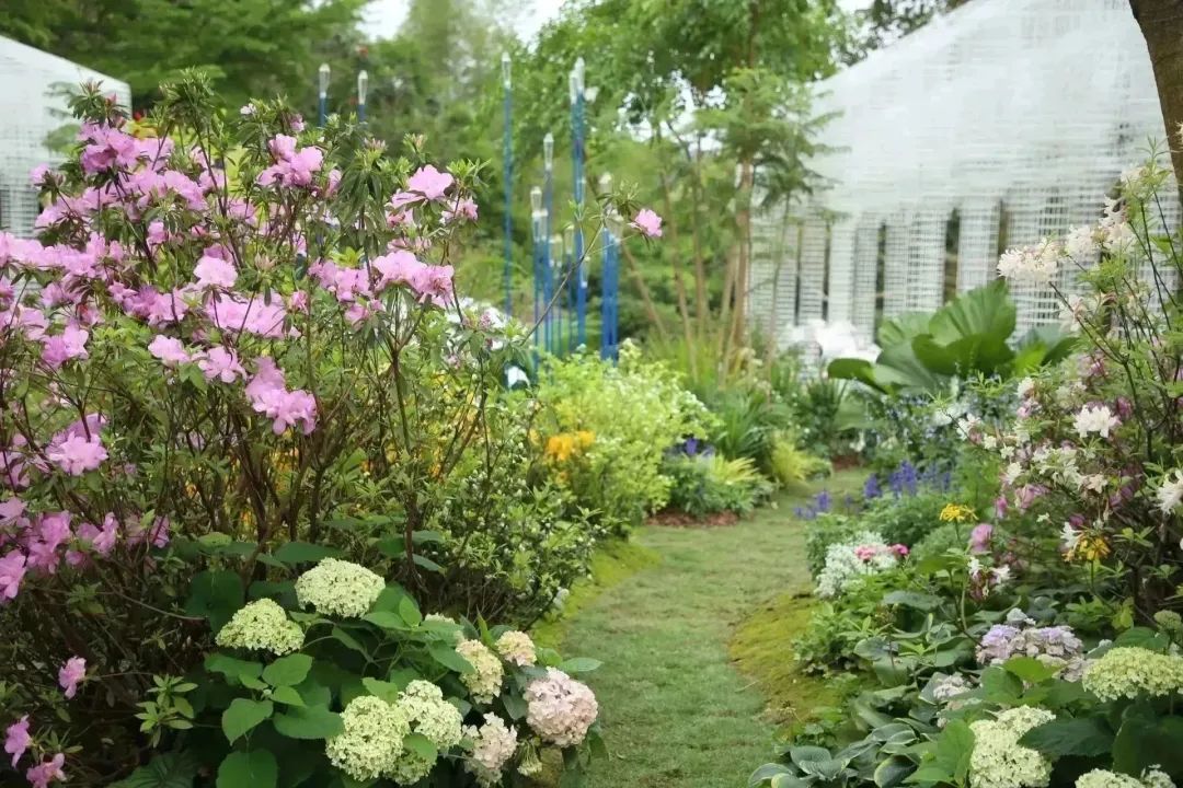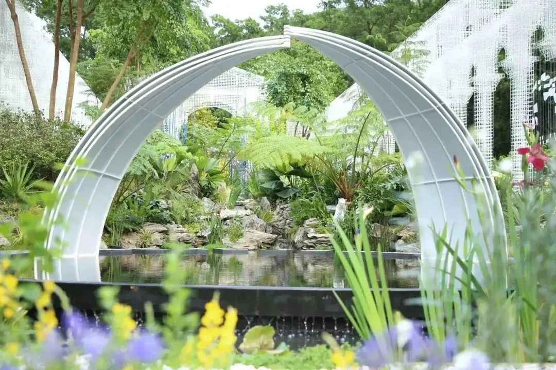 以“筑夢(mèng)伊甸園”為名,以經(jīng)典葡式莊園庭院為原型,以花為材,橫琴展園將多種粵澳特色元素與綠色環(huán)保理念相結(jié)合,串聯(lián)起“落花”、“乘風(fēng)”、“盈滿”三大主題空間,園內(nèi)共展示了幌傘楓、桫欏、鳳尾蕨等橫琴本土植物和杜鵑、月季、百子蓮等新品種植物共計(jì)130余種。