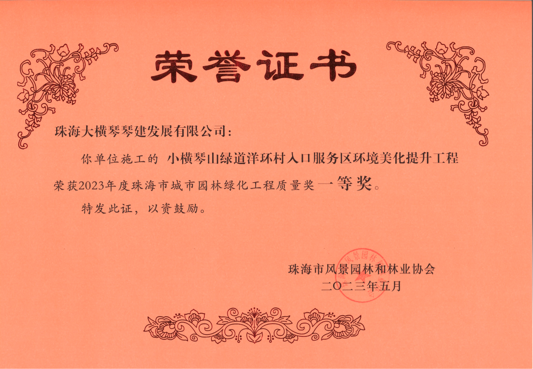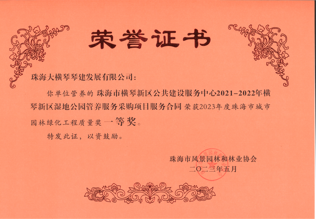 近日,珠海大橫琴琴建發(fā)展有限公司、珠海市橫琴新區(qū)公共建設(shè)服務(wù)中心,2021-2022年橫琴新區(qū)濕地公園管養(yǎng)服務(wù)采購項目服務(wù)合同,小橫琴山綠道洋環(huán)村入口服務(wù)區(qū),環(huán)境美化提升工程,以及作為代建單位負責建設(shè)的古樹名木公園(粗沙環(huán))項目,榮獲由珠海市風景園林和林業(yè)協(xié)會頒發(fā)的2023年度珠海市城市園林綠化工程質(zhì)量獎一等獎。