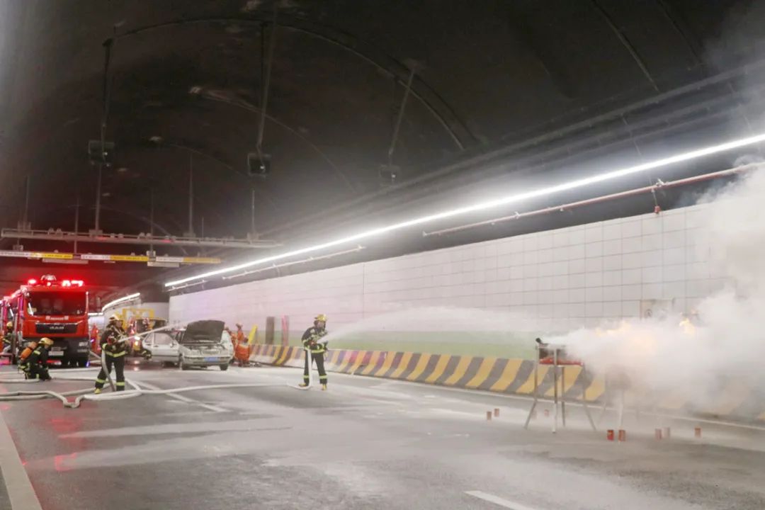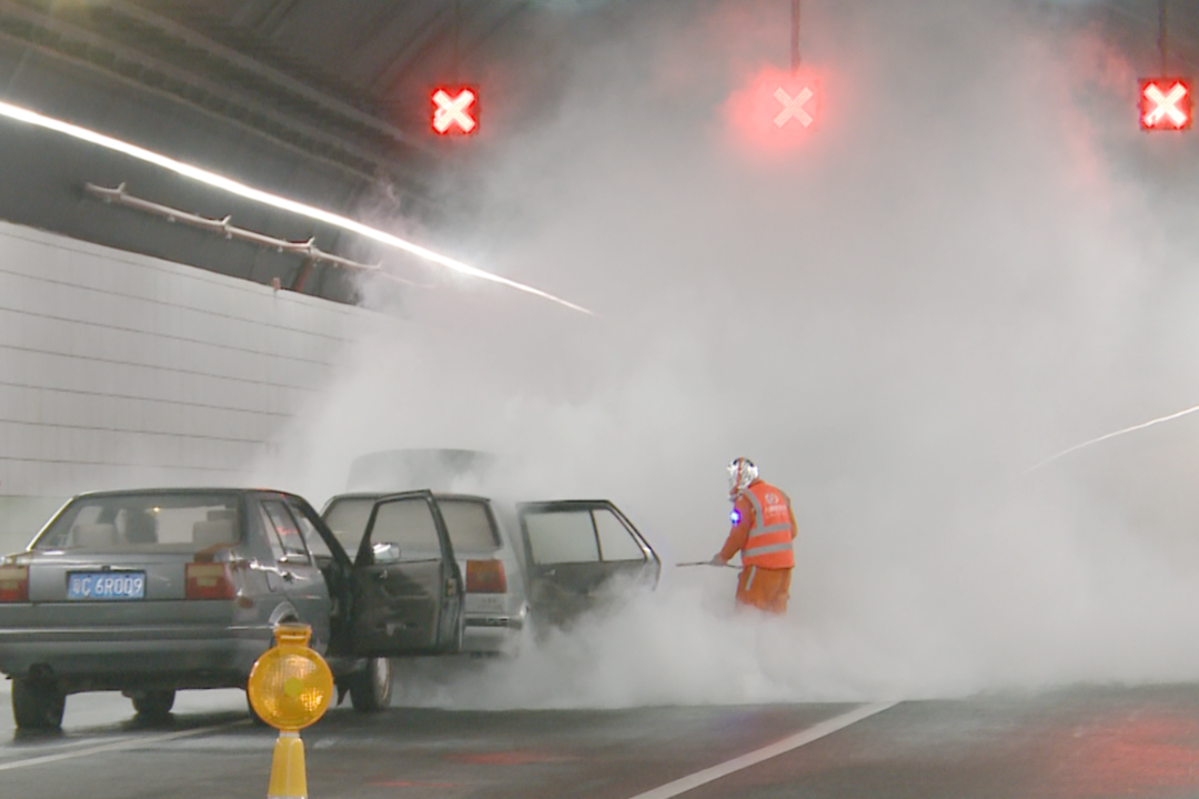 守護安全,分秒必爭。隧道運行環(huán)境錯綜復雜,推動“人治”向“智治”轉(zhuǎn)變尤為重要。本次演練增設了消防噴淋系統(tǒng)演練環(huán)節(jié),真實呈現(xiàn)系統(tǒng)自動滅火過程。隧道火焰探測器感應到火災后自主發(fā)出告警信息,啟動噴淋系統(tǒng)滅火,做到安全、迅速、及時。