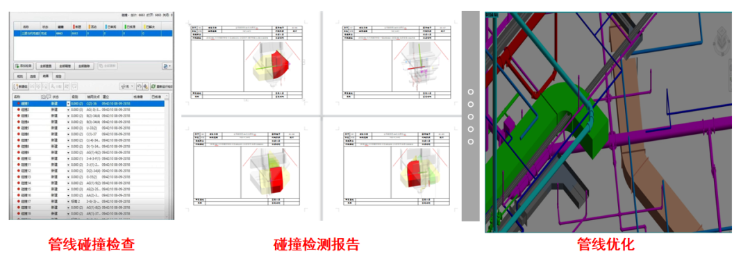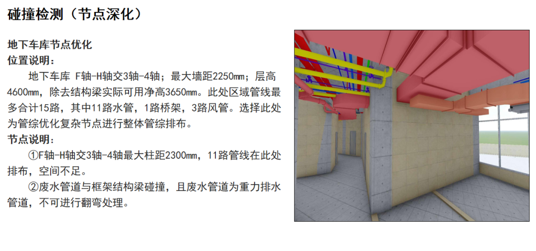 對綜合樓區(qū)域的機(jī)電模型進(jìn)行專業(yè)間的碰撞檢測,導(dǎo)出碰撞檢測報告并進(jìn)行分析,結(jié)合圖紙會審結(jié)果,進(jìn)行機(jī)電管線綜合優(yōu)化。本次項目共優(yōu)化329余處,解決機(jī)電碰撞點(diǎn)329處,解決凈高問題53處。