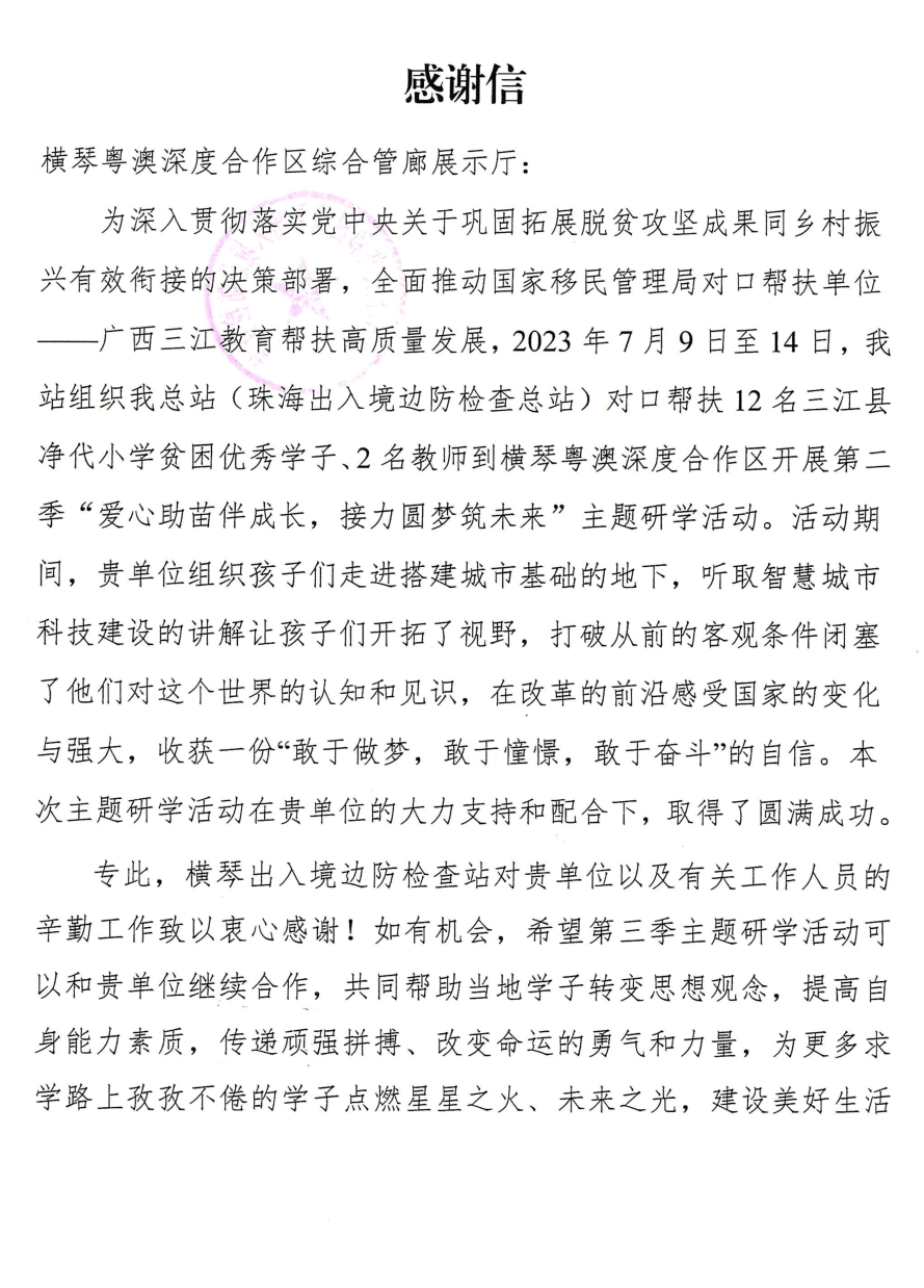 積極協(xié)助橫琴出入境邊防檢查站的“愛心助苗伴成長,接力圓夢筑未來”活動,從云端到地下娓娓介紹,幫助優(yōu)秀三江學(xué)子感知國際化都市的發(fā)展脈搏,了解智慧城市的科技建設(shè),得到橫琴出入境邊防檢查站和參觀學(xué)子的肯定和感謝。