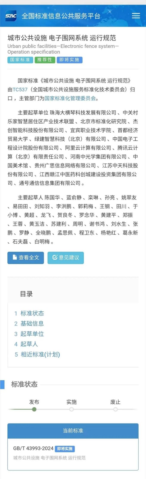 GB/T 43993-2024《城市公共設(shè)施 電子圍網(wǎng)系統(tǒng) 運行規(guī)范》于2021年12月立項,由大橫琴科技公司主導(dǎo)制定,TC537全國城市設(shè)施服務(wù)標(biāo)準(zhǔn)化技術(shù)委員會提供指導(dǎo)。標(biāo)準(zhǔn)制定工作組經(jīng)過深度場景調(diào)研、密集專題討論、廣泛征求意見、嚴(yán)格技術(shù)審查,歷經(jīng)兩年研制周期,最終確立了電子圍網(wǎng)系統(tǒng)運行架構(gòu),明確了運行總體原則,并對電子圍網(wǎng)系統(tǒng)的運行資源、運行服務(wù)、運行評價改進(jìn)進(jìn)行了全面規(guī)范化。該標(biāo)準(zhǔn)于2024年4月25日正式發(fā)布,并于2024年11月1日起正式實施。