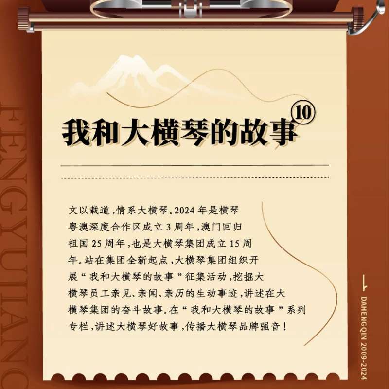 文以載道,情系大橫琴。2024年是橫琴粵澳深度合作區(qū)成立3周年,澳門回歸祖國(guó)25周年,也是大橫琴集團(tuán)成立15周年。站在集團(tuán)全新起點(diǎn),大橫琴集團(tuán)組織開展“我和大橫琴的故事”征集活動(dòng),挖掘大橫琴員工親見、親聞、親歷的生動(dòng)事跡,講述在大橫琴集團(tuán)的奮斗故事。大橫琴集團(tuán)公眾號(hào)將陸續(xù)推出“我和大橫琴的故事”系列專欄,講述大橫琴好故事,傳播大橫琴品牌強(qiáng)音!